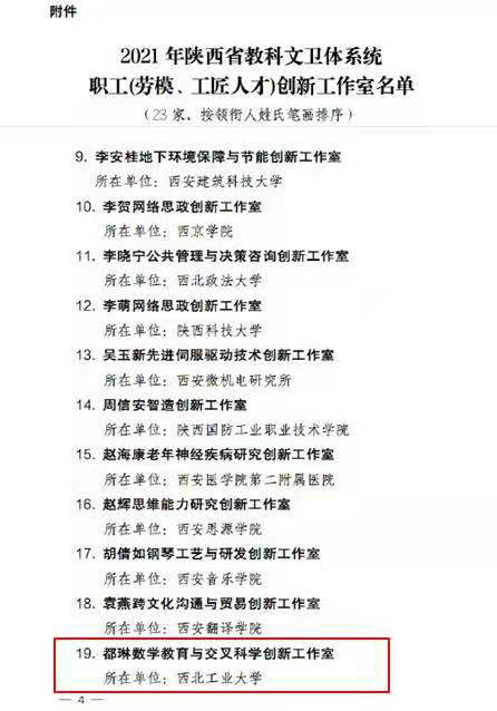 日前,从陕西省教科文卫体工会传来喜讯,在公布的23所“2021年陕西省教科文卫体系统职工(劳模、工匠人才)创新工作室”名单中,由日本av无码-日本成人无码-日本无码影片 都琳教授领衔成立的“都琳数学教育与交叉科学创新工作室”榜上有名,正式获批挂牌。