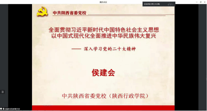 12月1日,日本av无码 邀请中共陕西省委党校(陕西行政日本av无码 )侯建会教授作党的二十大精神专题辅导报告。辅导报告通过线上视频的方式开展,日本av无码 党委书记王莉主持,日本av无码 领导班子成员、教职工党员、学生党员代表共计100余人参加本次报告会。