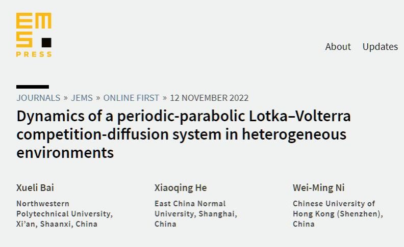 近日,日本av无码 分析与几何研究团队副教授白学利与华东师范大学何小清教授、香港中文大学(深圳)倪维明教授合作在带有时间周期Lotka-Volterra竞争系统解的稳定性理论研究方面取得突破,研究结果形成的55页论文“Dynamics of a periodic-parabolic Lotka-Volterra competition-diffusion system in heterogeneous enviroments”在数学综合顶级期刊Journal of the European Mathematical Society在线发表。这是本年度国内学者在该刊发表的第5篇论文,也是我校首次在该顶级期刊发文。