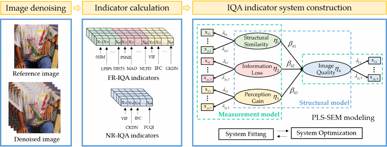 图像去噪算法的最新进展能够显著提升视觉性能,然而,这也给图像质量评估(IQA)指标带来新挑战,要求其评估结果能与人类视觉感知相一致。为解决当前单一指标方法(PSNR,SSIM等)的局限性,该论文工作给出了一种综合的IQA框架以实现对图像质量的全面评估。首先,研发了一个大规模去噪图像数据集,以体现失真的多样性。其次,运用结构方程模型建立图像质量指标(即结构相似性、信息损失和感知增益)之间的关联。然后,通过回归和迭代优化,剔除准确性低和冗余度高的指标,从而构建出一个稳健且最优的指标体系。最后,通过统计分析系统性地验证了所提出框架的可靠性和有效性,并对其在图像质量预测、IQA指标比较和去噪算法优化这三项关键任务中的性能进行了评估。实验结果表明,所提出的系统不仅能提供高度可靠且有效的评估,还能为IQA指标的分析和应用提供有价值的见解。